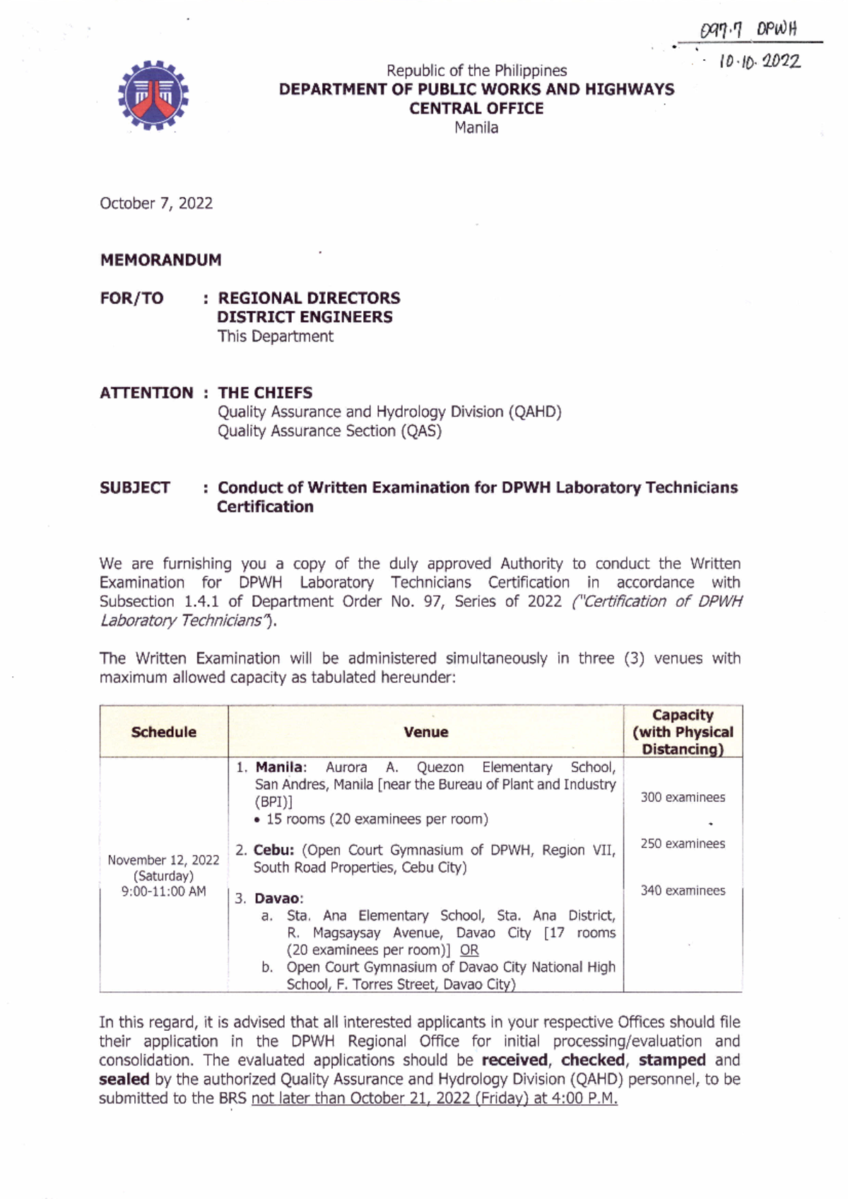 Memo 097 7 Conduct of Written Exam for DPWH Laboratory Tech