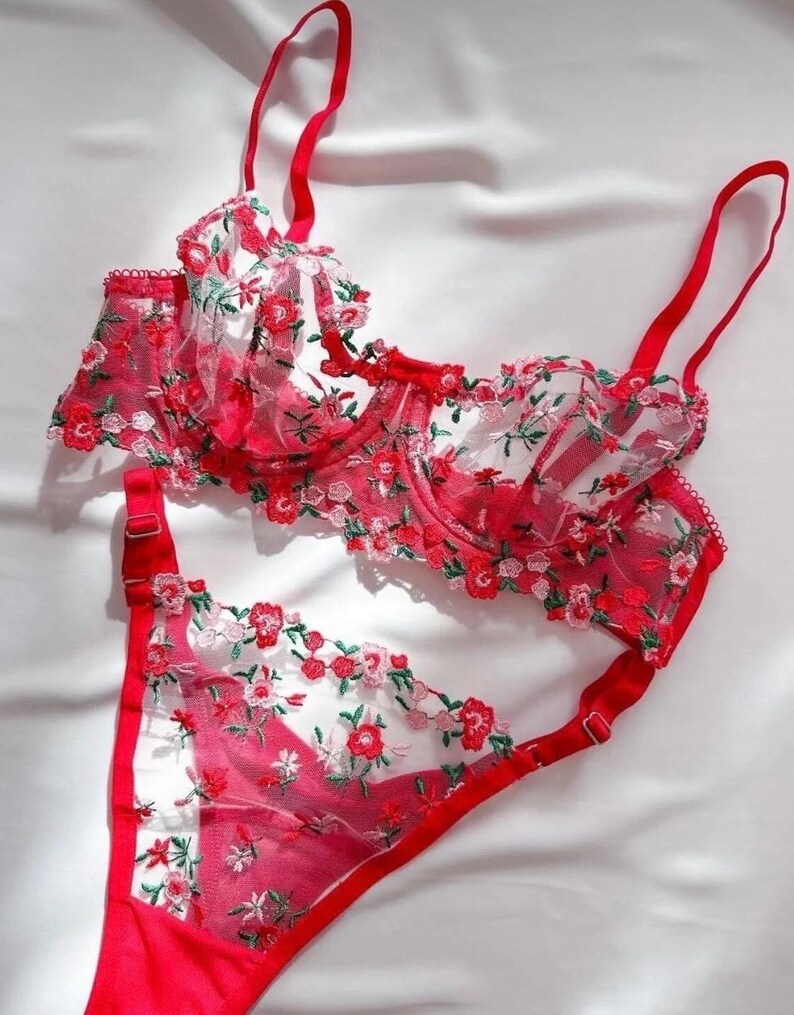Vintage Red Sheer Tulle Bralette Set With Rose Motifs Etsy
