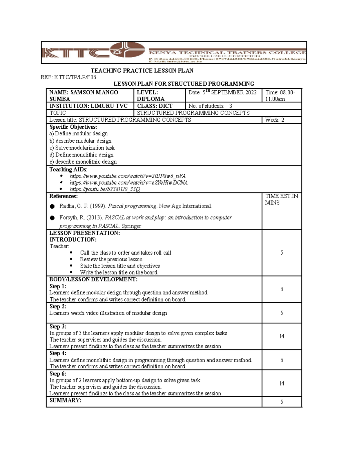 Print SP Lesson Plans 11pgsx2 TEACHING PRACTICE LESSON PLAN REF: KTTC