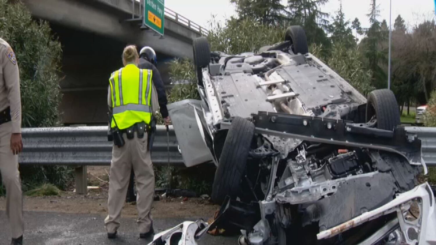 Photos: Driver crashes off overpass and into interstate median in