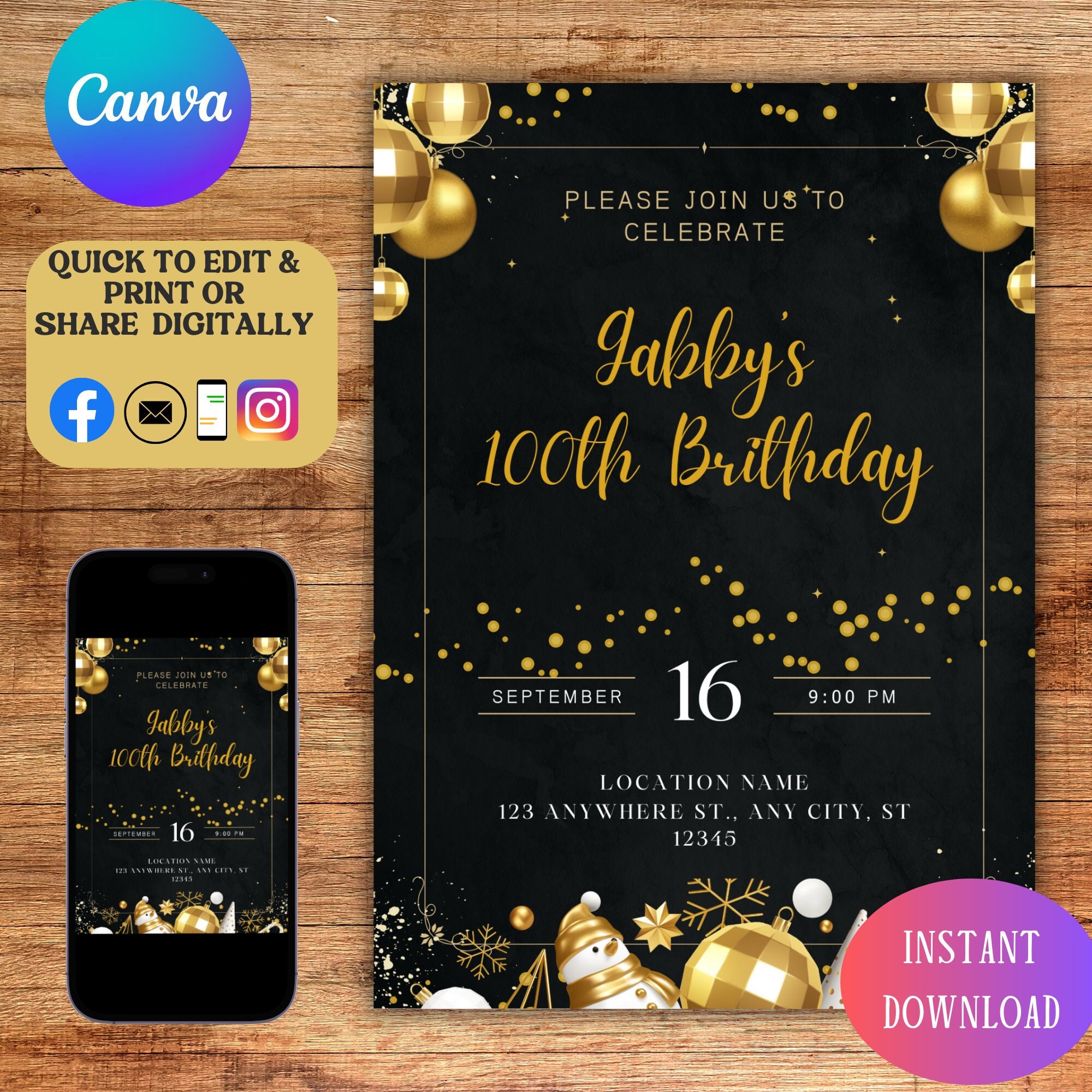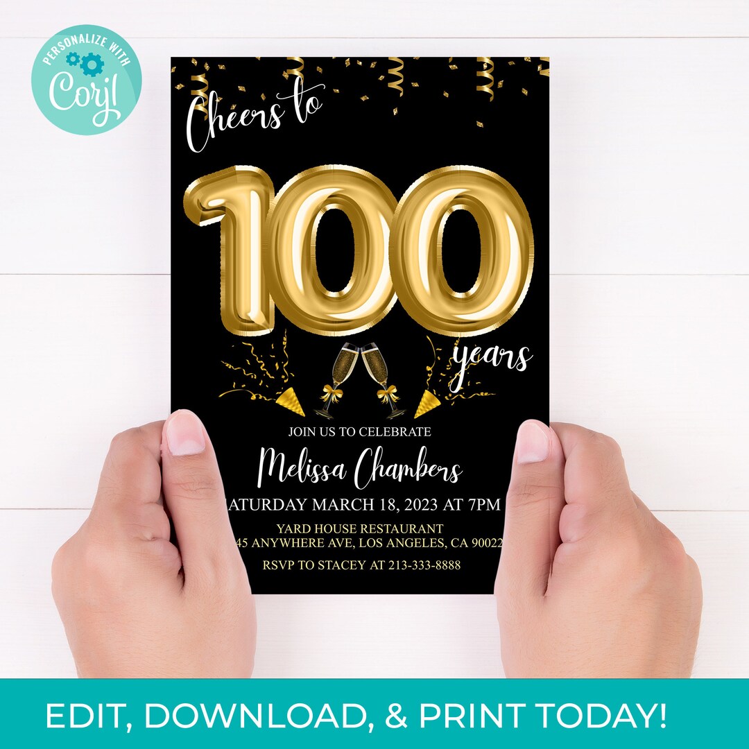 100th Birthday Editable Invitation 100th Invite Black Gold Balloons