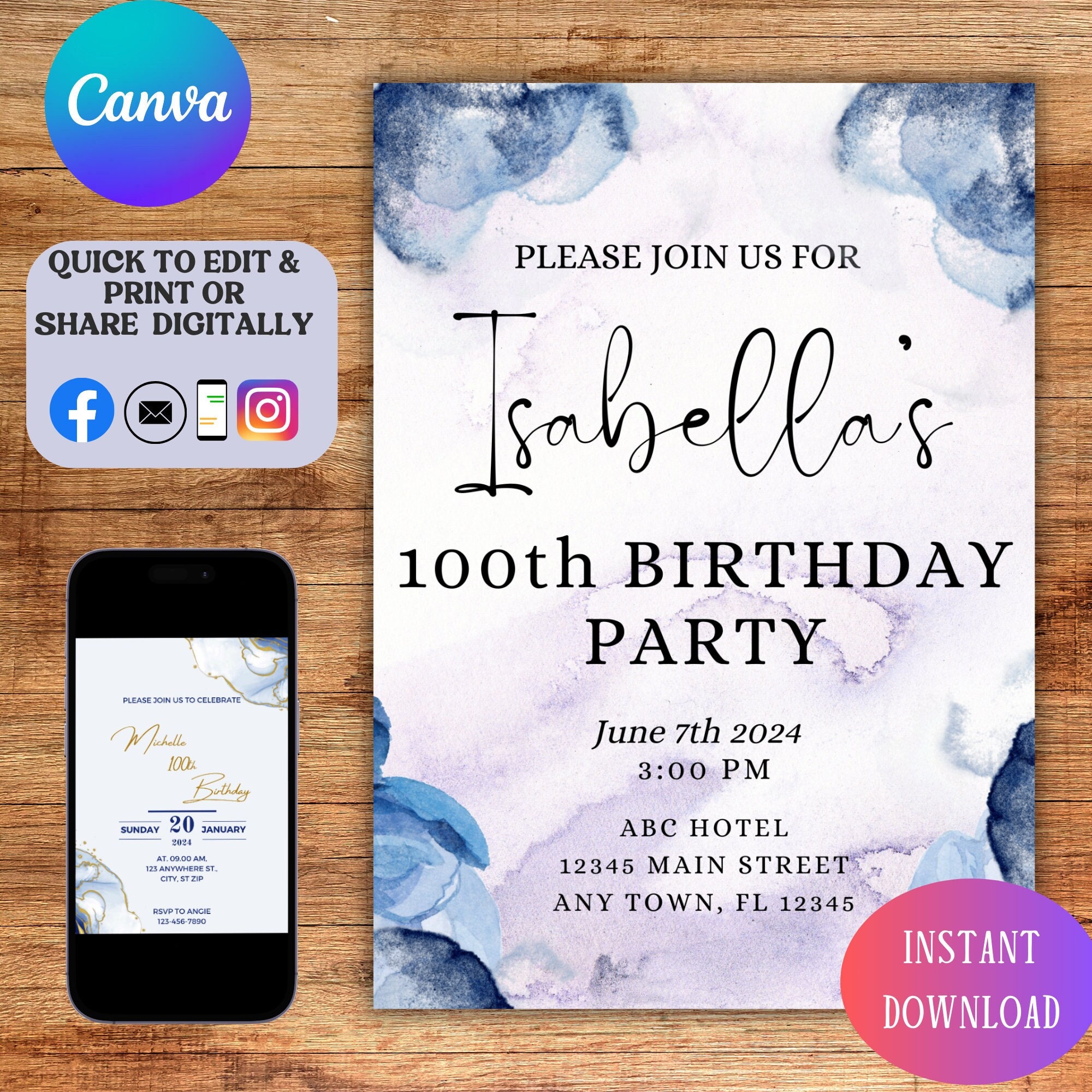 100th Birthday Invitation Template Editable 100th Birthday Digital
