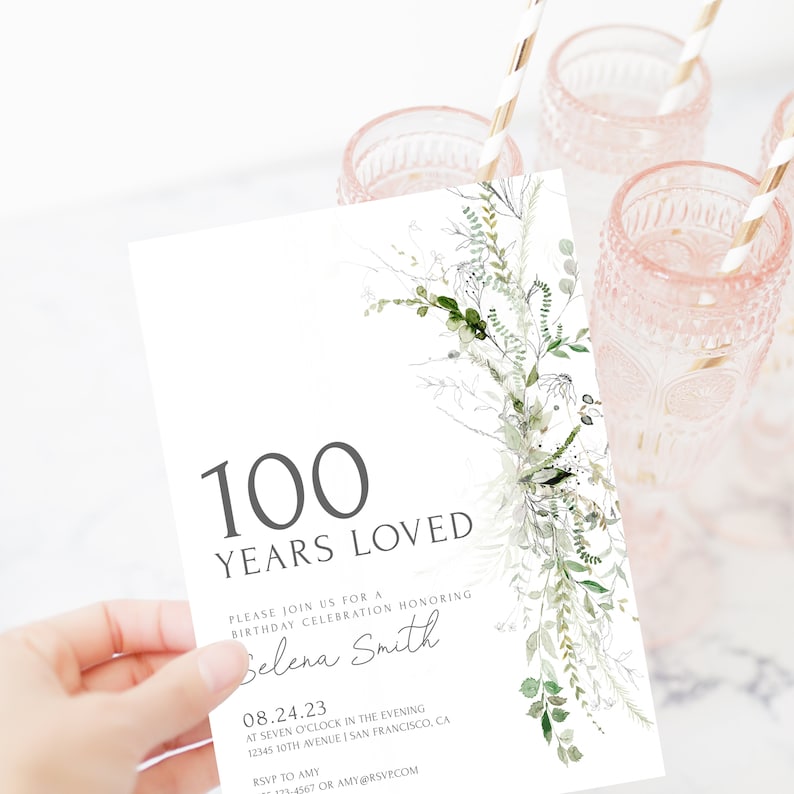 100th Birthday Party Invitation Template With Greenery 100 Birthday