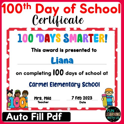 Happy 100th Day of School Certificate 100 Days of School Certificate
