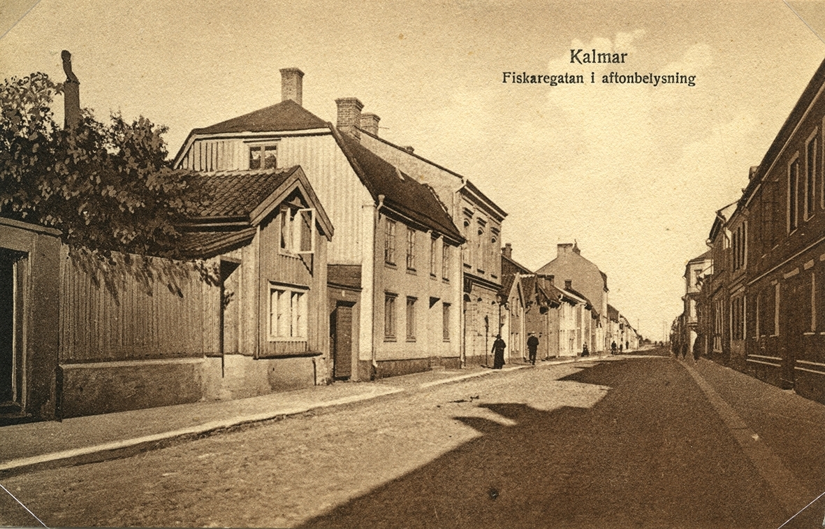 Text på vykort: quot Kalmar Fiskaregatan i aftonbelysning quot Kalmar läns