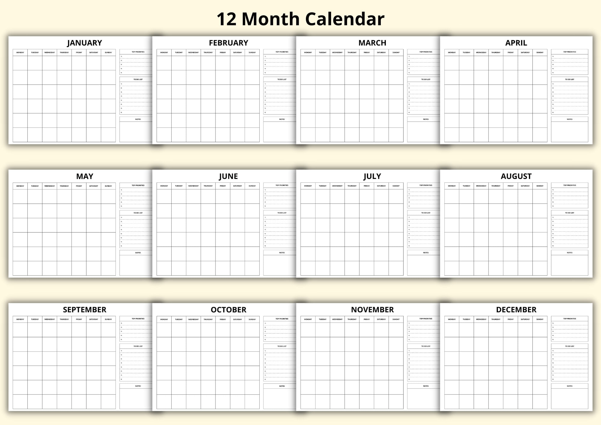 Calendar Template Editable 12 Month Blank Calendars Undated Instant