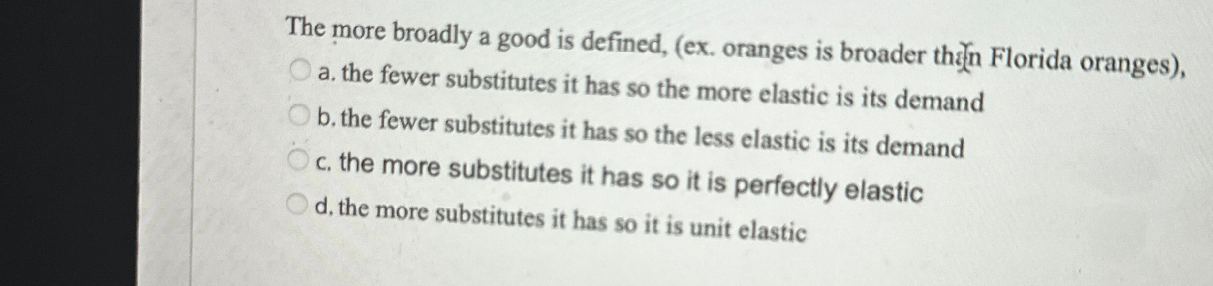 Solved The more broadly a good is defined (ex oranges is Chegg com