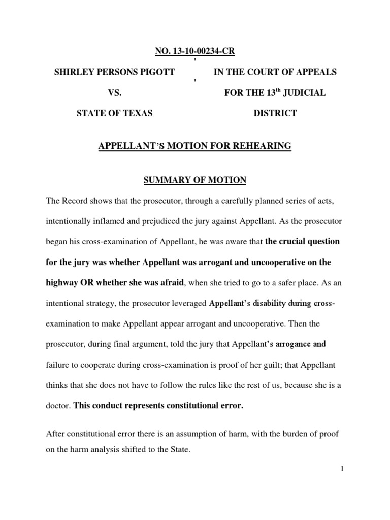 Pigott Motion For Rehearing 13th Court of Criminal Appeals PDF