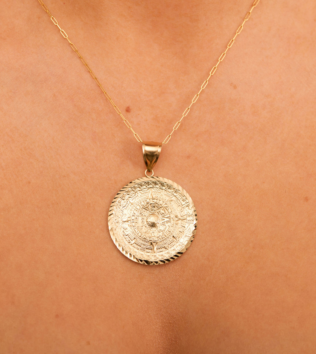 14k Gold Aztec Calendar Charm Necklace OLIVE CHAIN