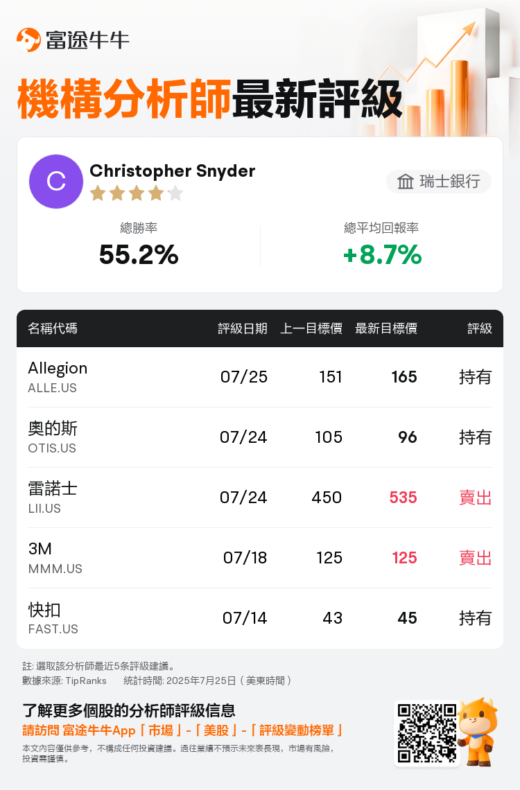 摩根士丹利維持Allegion(ALLE US)持有評級,上調目標價至165美元