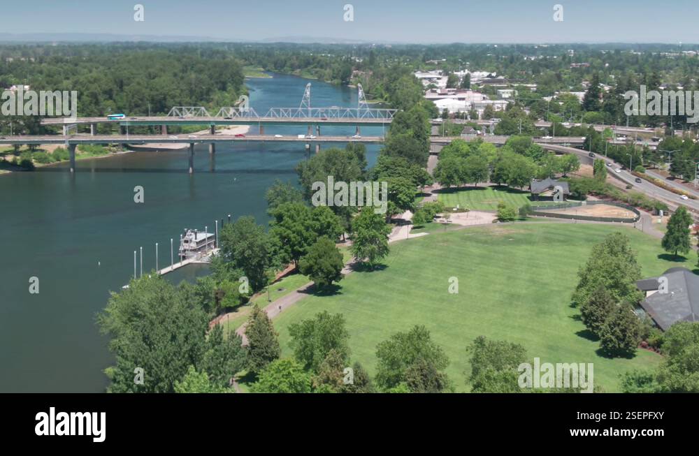 Aerial: Freeway bridges crossing the Willamette River Salem Oregon