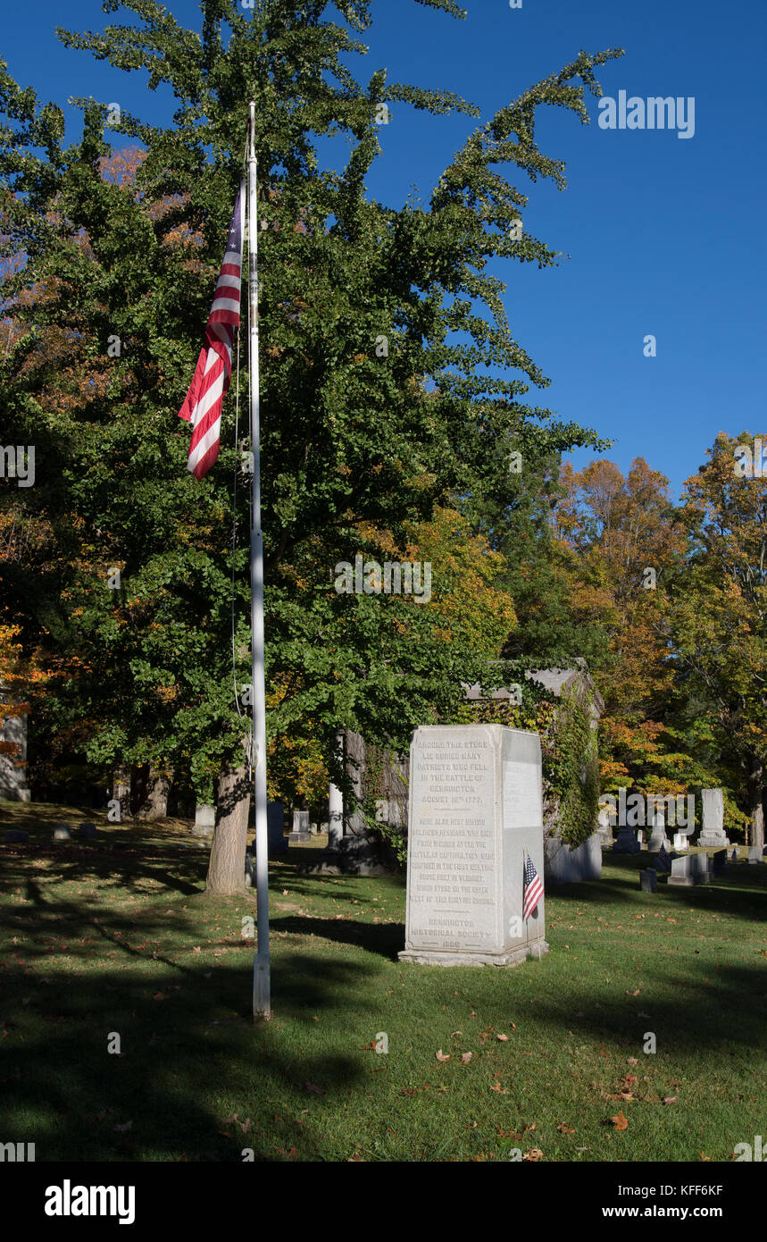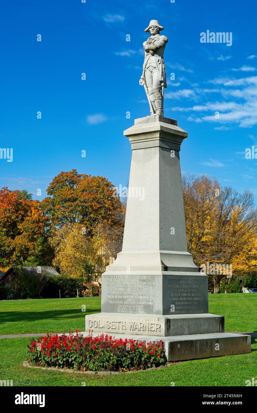 1911 granite statue of Colonel Seth Warner surrounded by bright colored