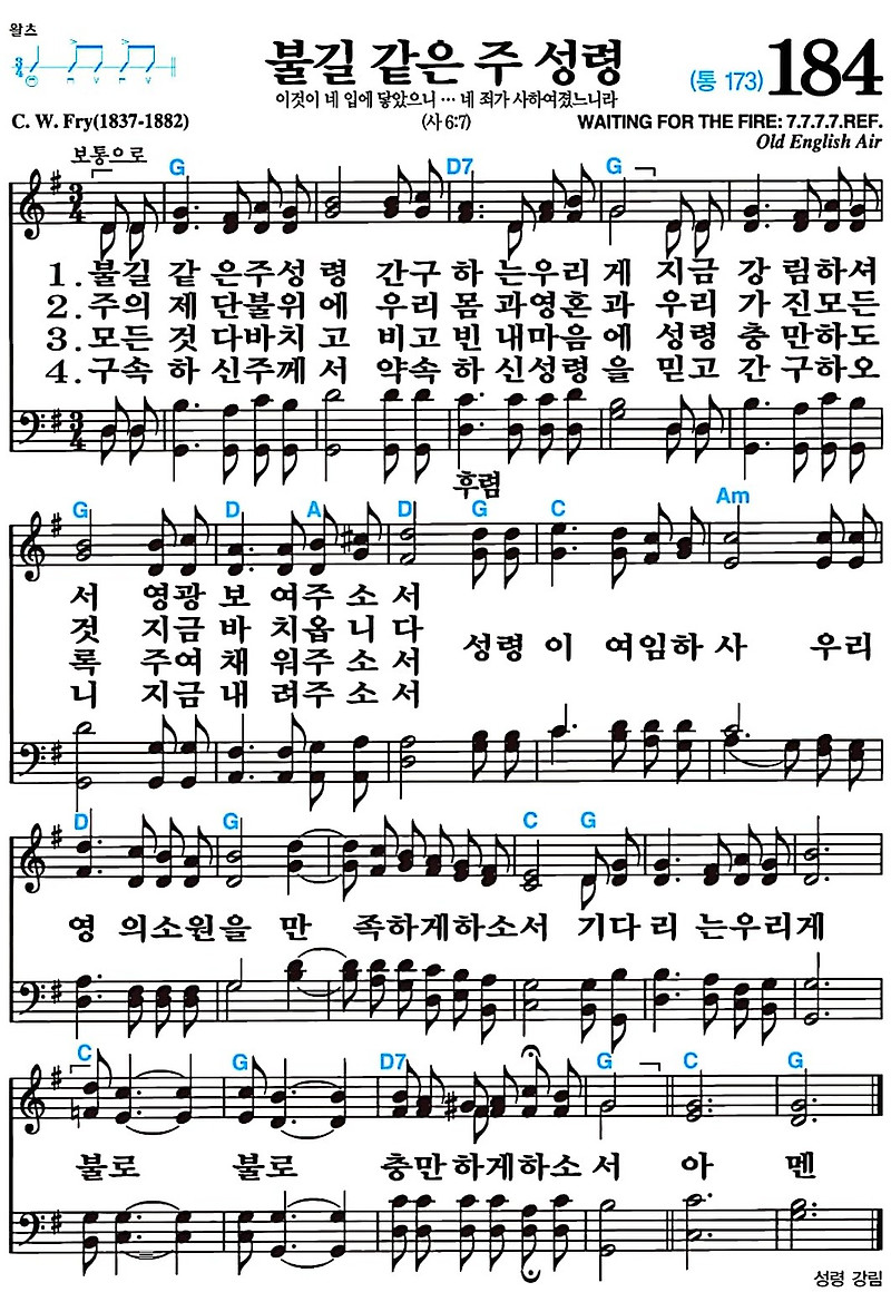 찬송가 184장 불길같은 주 성령 #가사/악보/NWC/MP3 다운로드