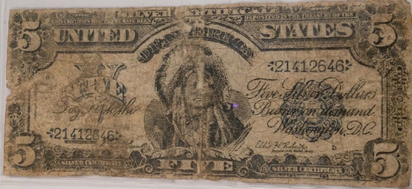 1899 Five Dollar Silver Certificate Indian Chief Running Antelope World