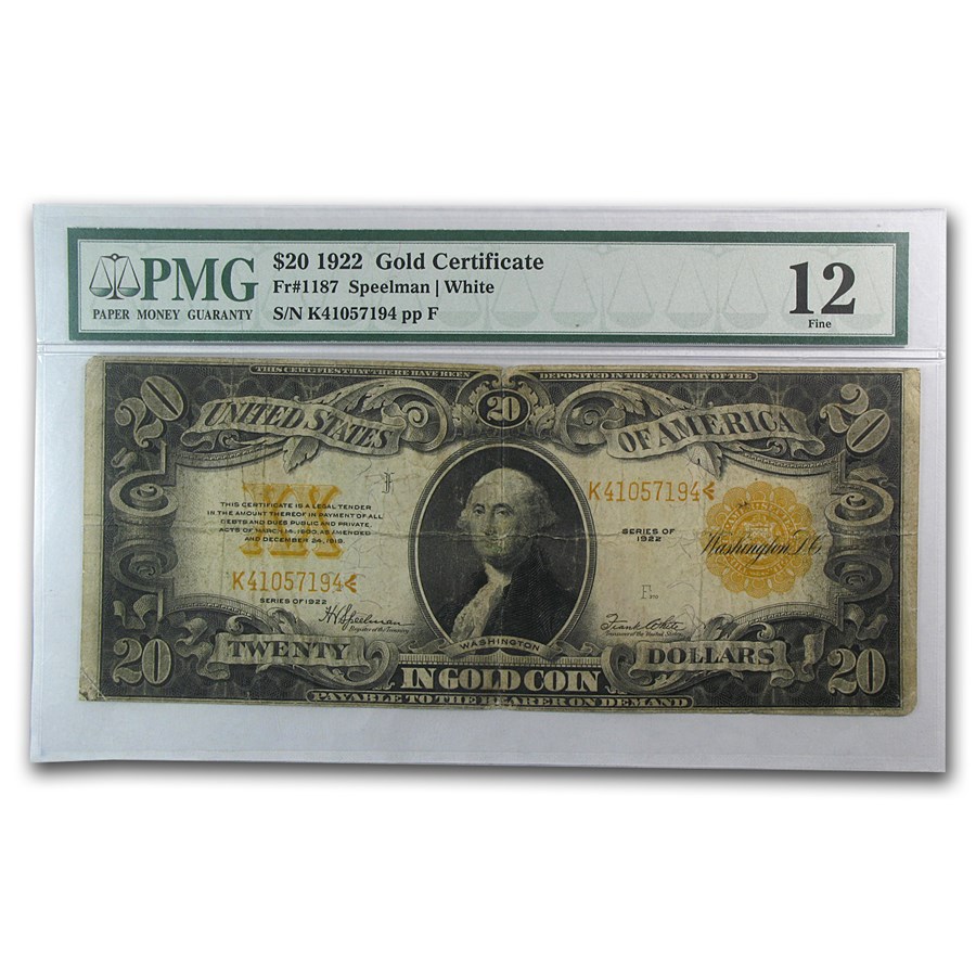 Buy 1922 $20 Gold Certificate Washington Fine 12 PMG APMEX