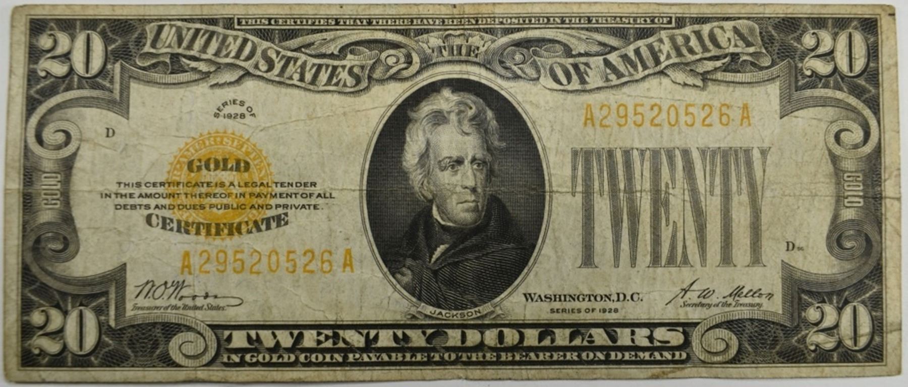 1928 $20 Gold Certificate Signatures Woods/mellon