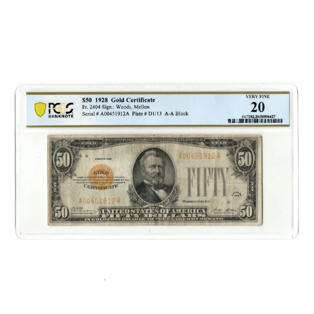 1928 $50 Gold Certificate Fr 2404 PCGS VF20 Pinehurst Coins