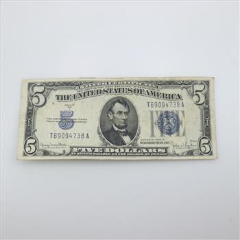 1934 C US Five Dollar Silver Certificate Blue Seal Property Room