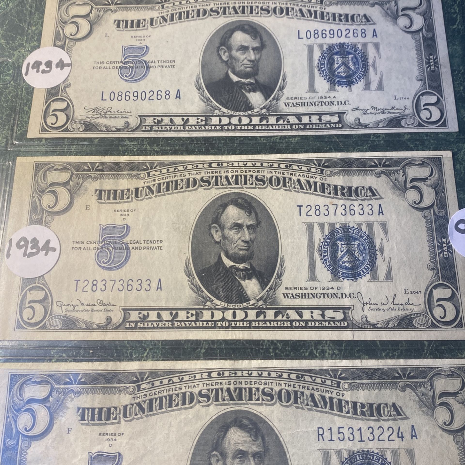 One 1934 $5 Silver Certificate One 1928b $5 United States Note