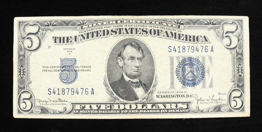 1934 D $5 Silver Certificate Blue Seal Property Room
