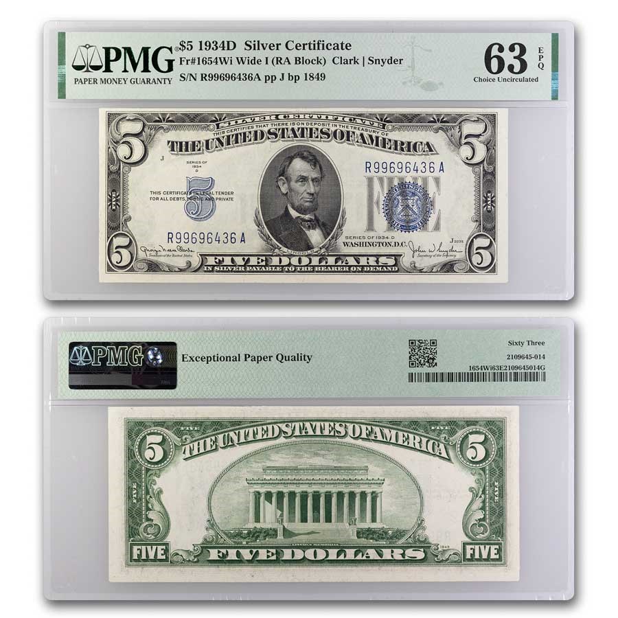 1934 D $5 00 Silver Certificate CU 63 EPQ PMG (Fr#1654) Wide I