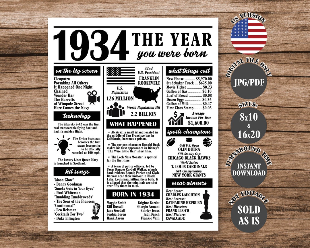 1934 Birthday NEWSPAPER Poster 1934 Newspaper Facts for Etsy