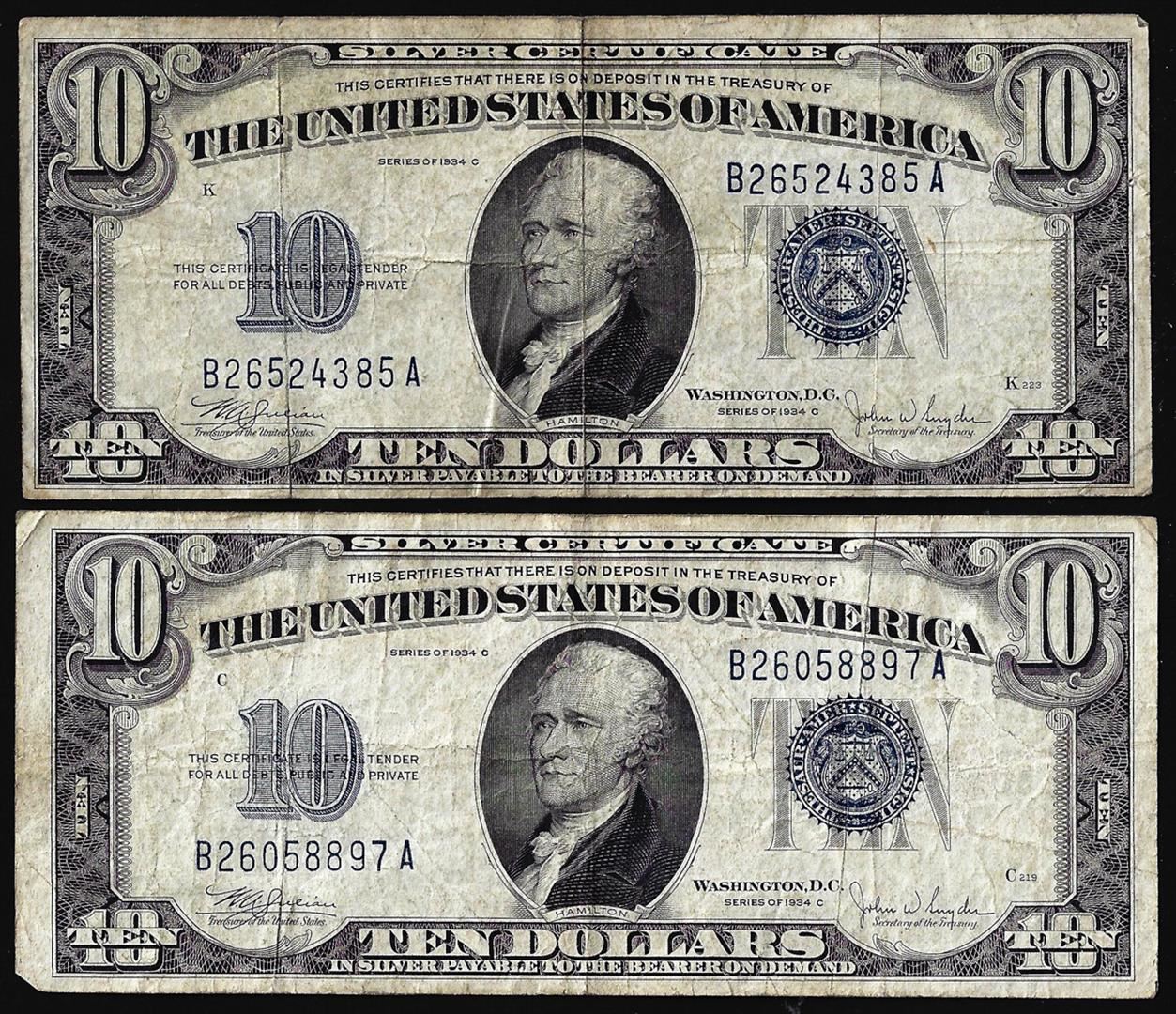 Lot of (2) 1934C $10 Silver Certificate Notes
