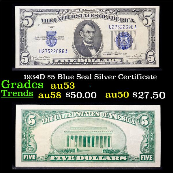 Bid Now: 1934D $5 Blue Seal Silver Certificate Grades Select AU