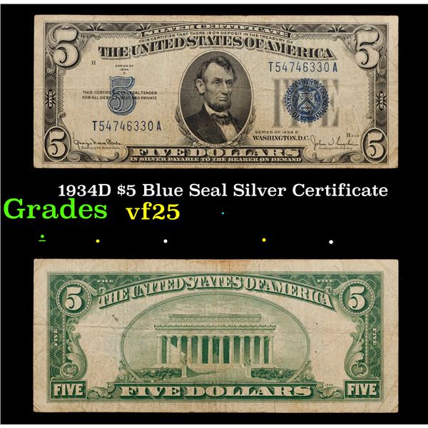 1934D $5 Blue Seal Silver Certificate Grades vf