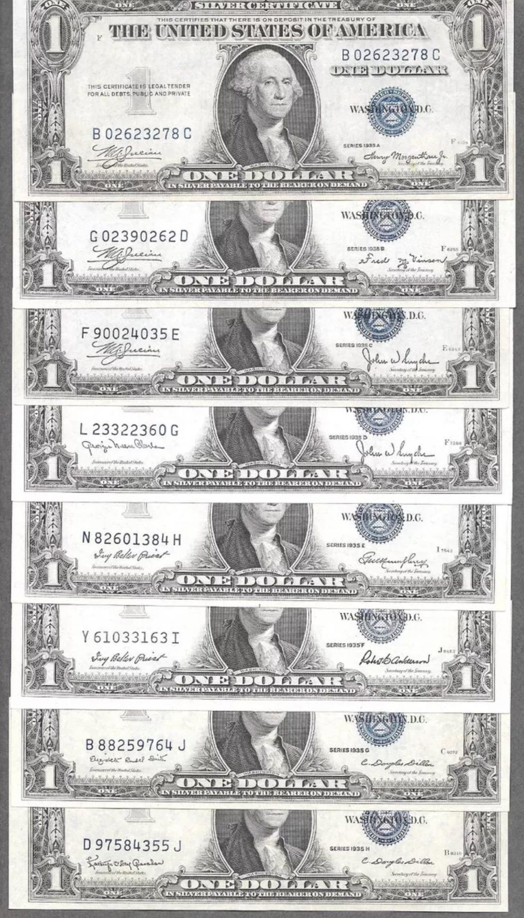 Complete Set of 9 Series 1935 1 dollar Silver Certificates Plain and A