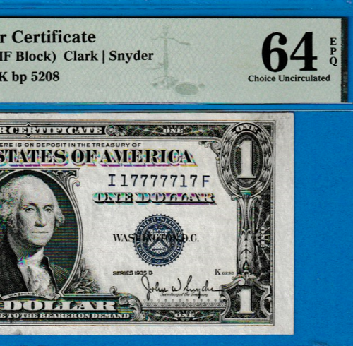 BINARY 1935 D $1 SILVER CERTIFICATE BOOKEND Serial Number I 17777717 F