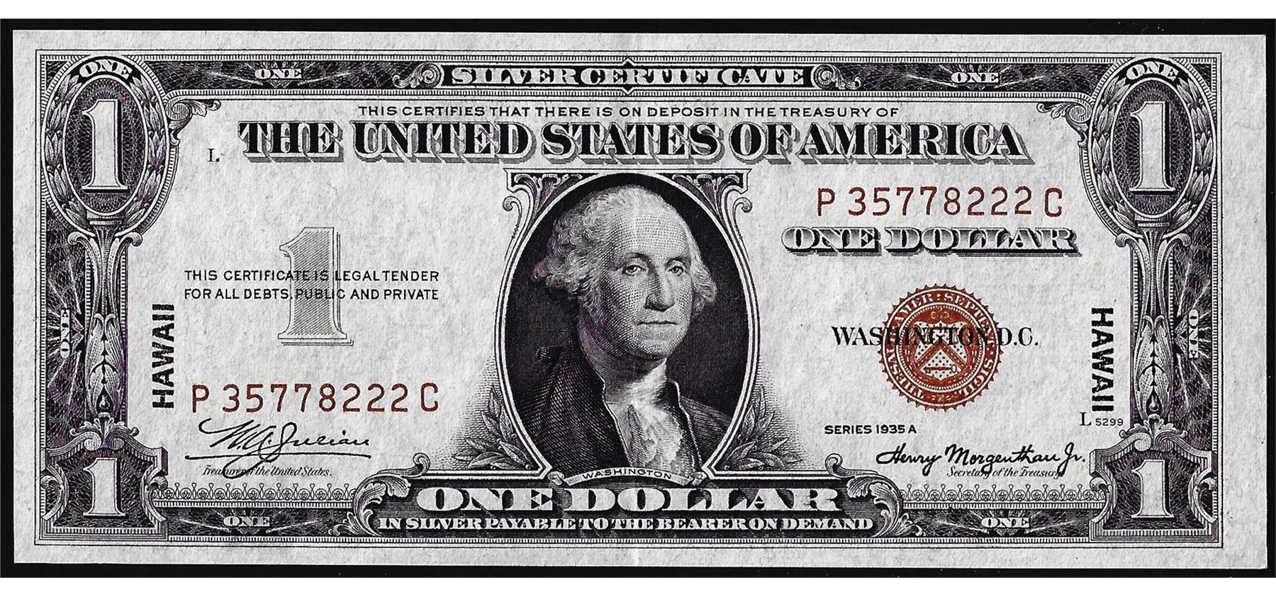 1935A $1 Silver Certificate Hawaii Signatures of Julian Morgenthau