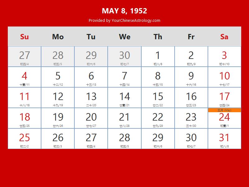 Chinese Calendar May 08 1952: Auspicious Things to Do and Hours Bazi