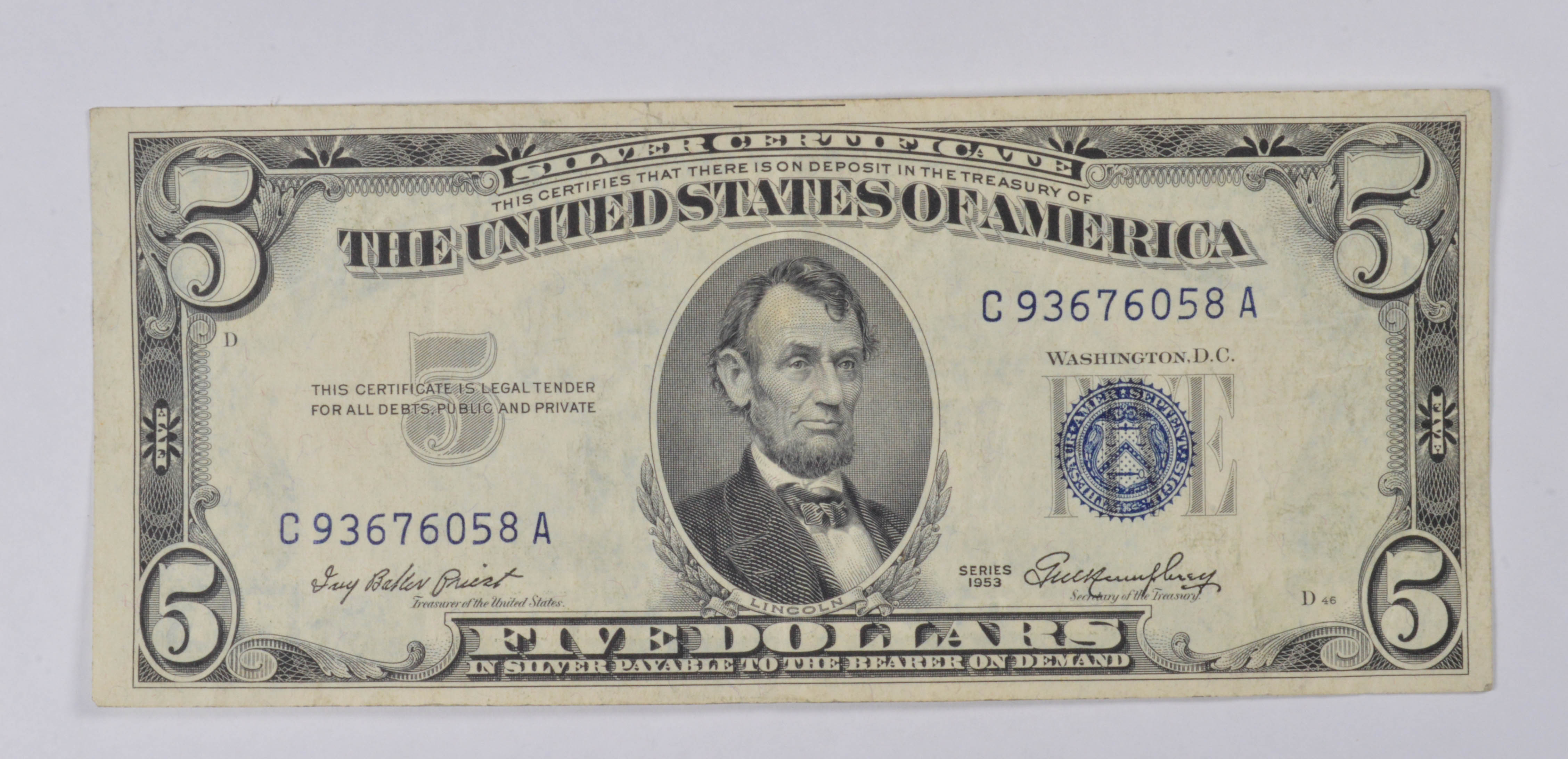 1953 FIVE DOLLAR SILVER CERTIFICATE BLUE SEAL