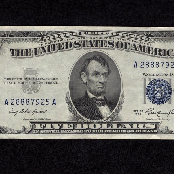 1953 5 Dollar Blue Seal Silver Certificate Series Old Real US Currency