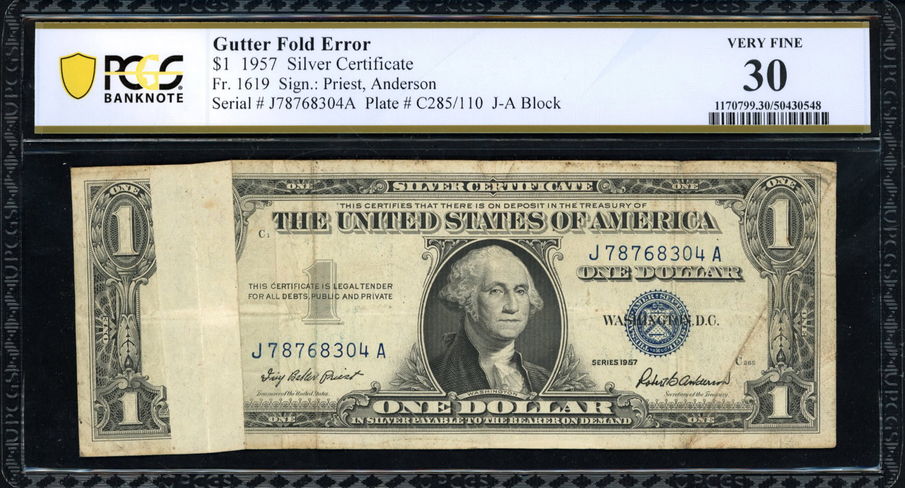 Fr 1619 (JA Block) 1957 $1 Silver Certificate Error Note Gutter Fold