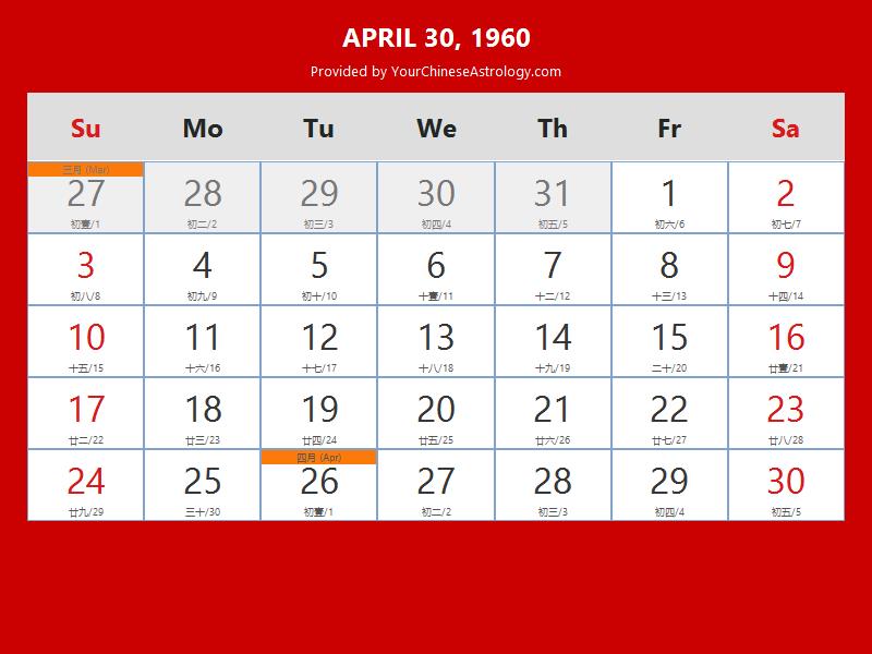 Chinese Calendar Apr 30 1960: Auspicious Things to Do and Hours Bazi