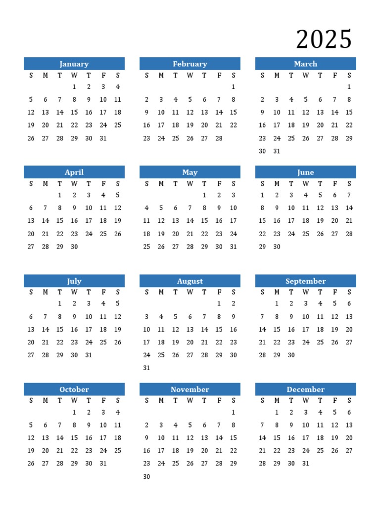 Free 2025 Year Calendar in PDF Word and Excel