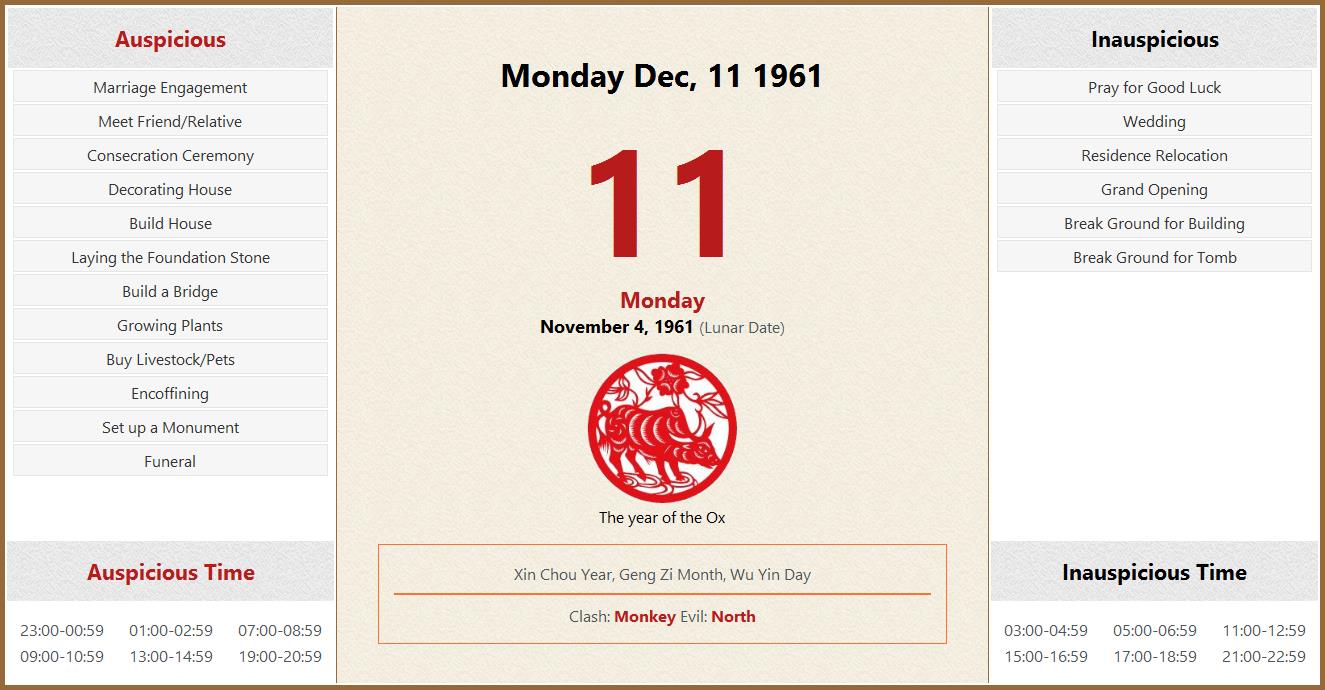 December 11 1961 Almanac Calendar: Auspicious/Inauspicious Events and