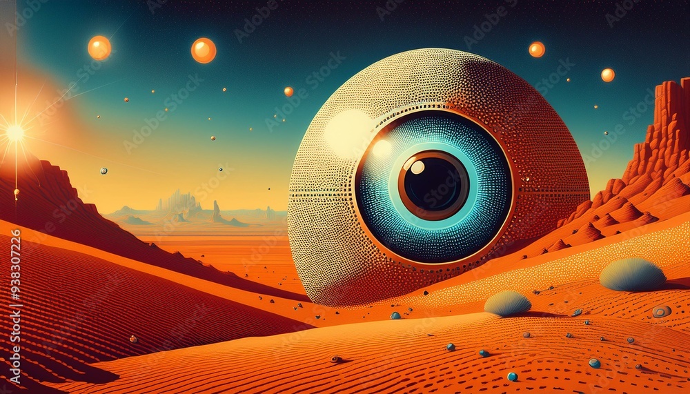 Vintage dot art scenery featuring extraterrestrial robotic space eye
