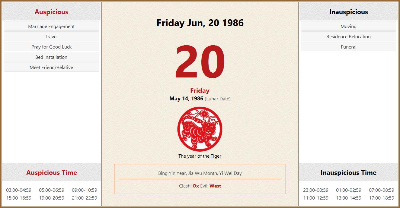 June 20 1986 Almanac Calendar: Auspicious/Inauspicious Events and Time