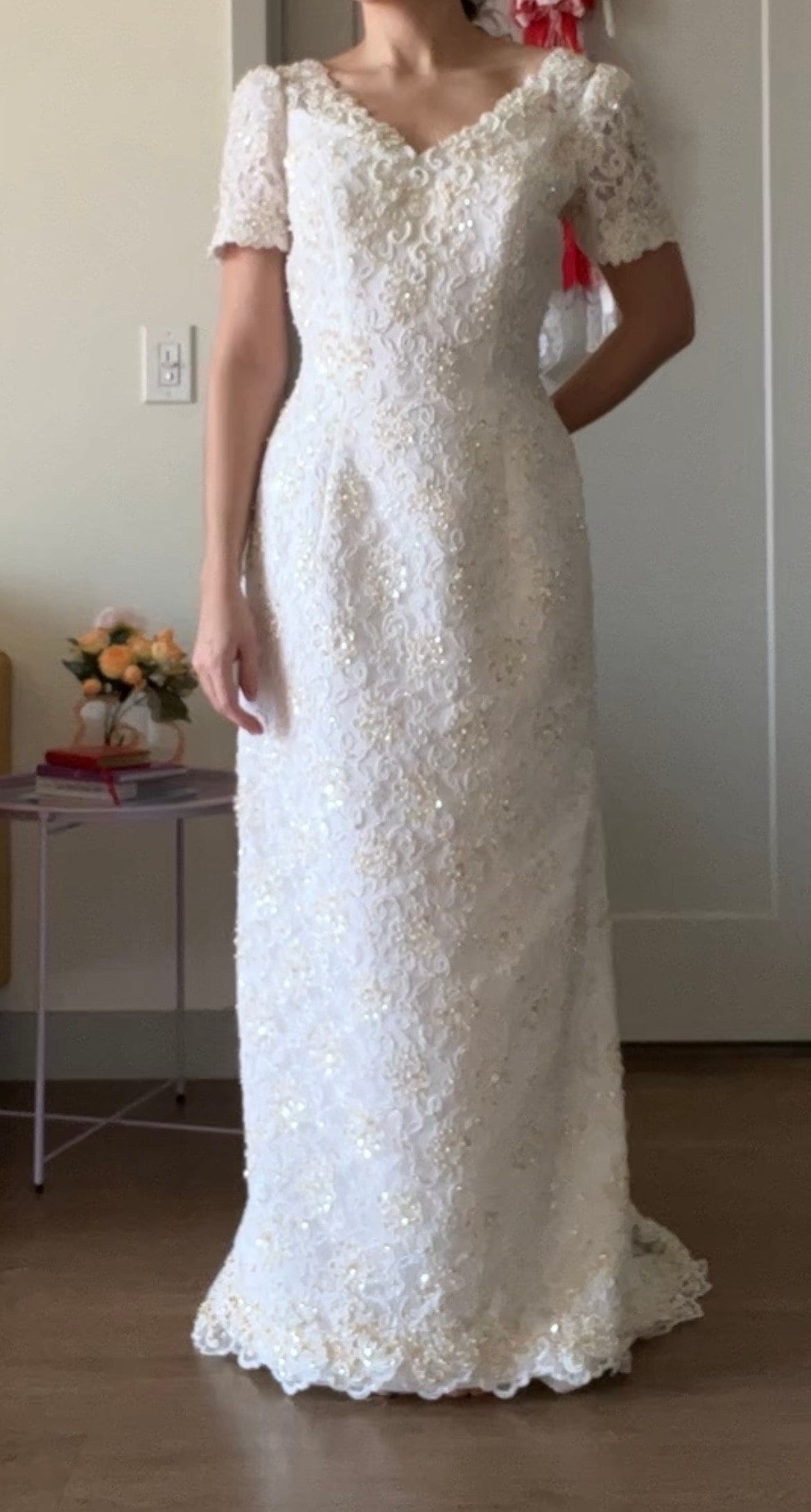 1990s Gloria Vanderbilt Column style Sequin Lace and Pearl beaded
