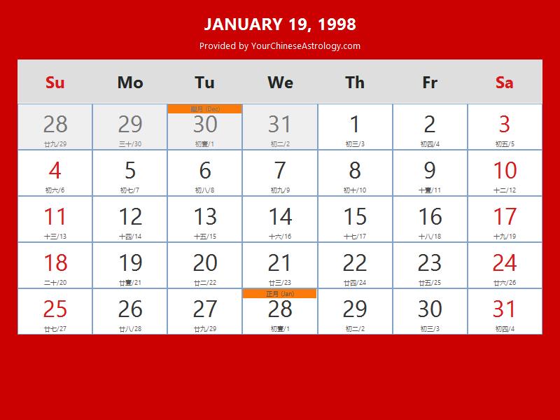 Chinese Calendar January 1998: Lunar Dates Auspicious Dates and Times