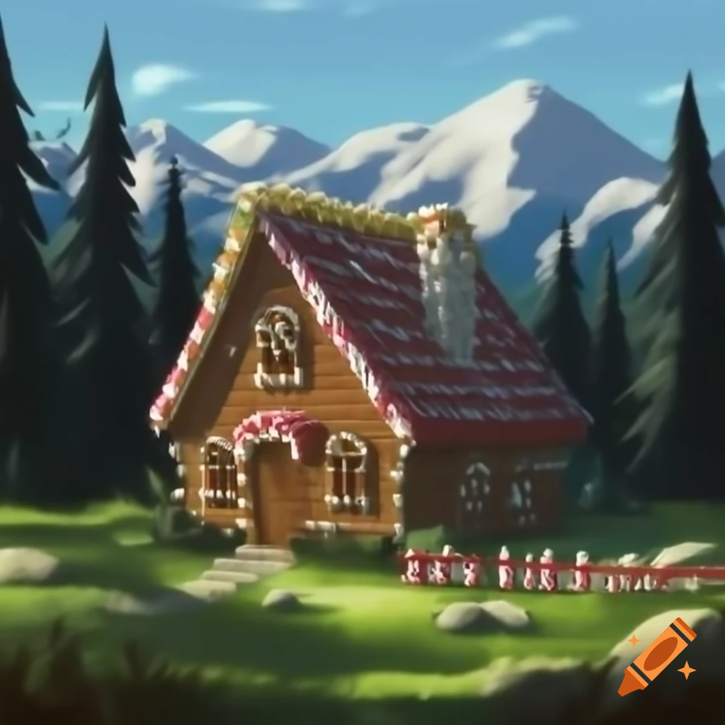 Two story gingerbread house cabin in woods with candy cane fence on Craiyon