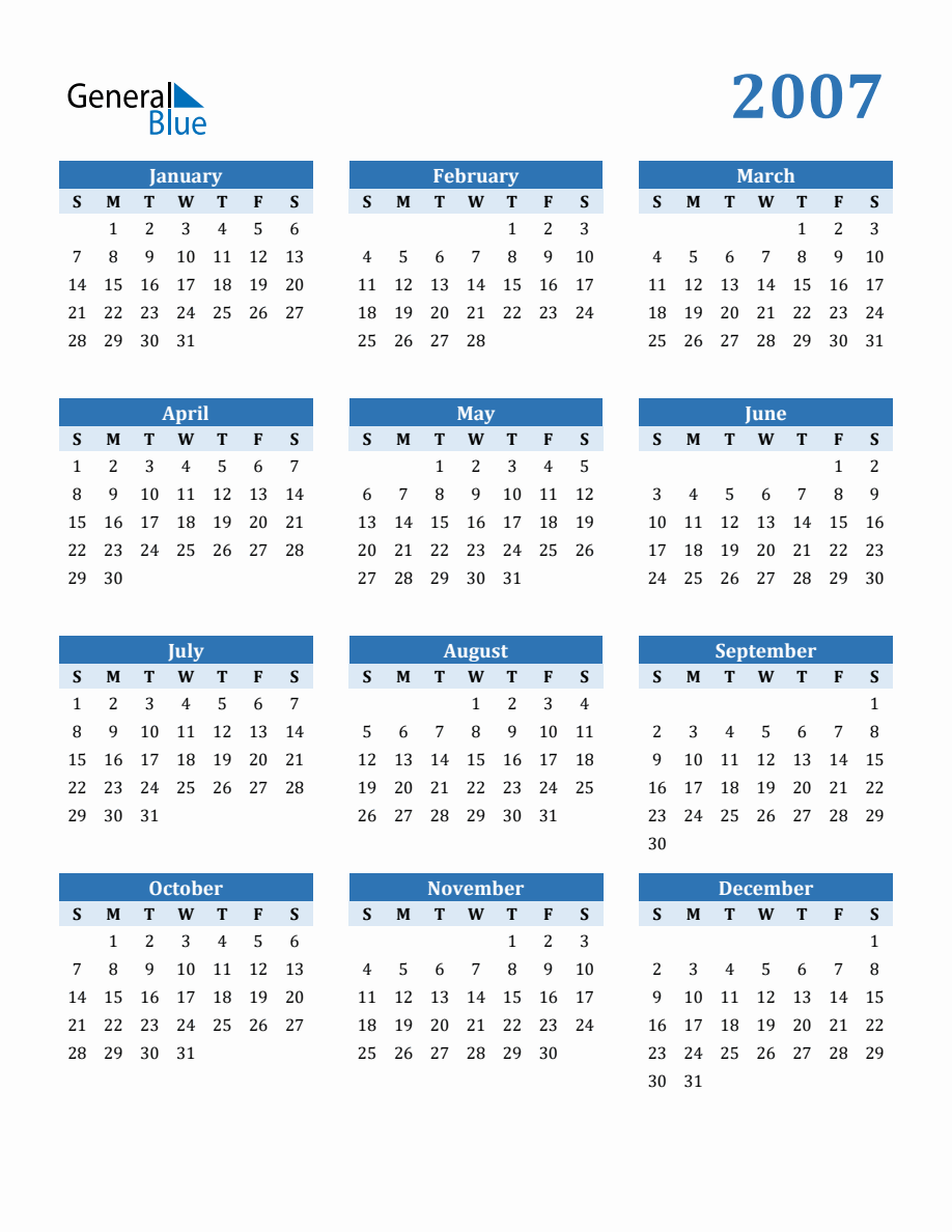 Free 2007 Year Calendar in PDF Word and Excel