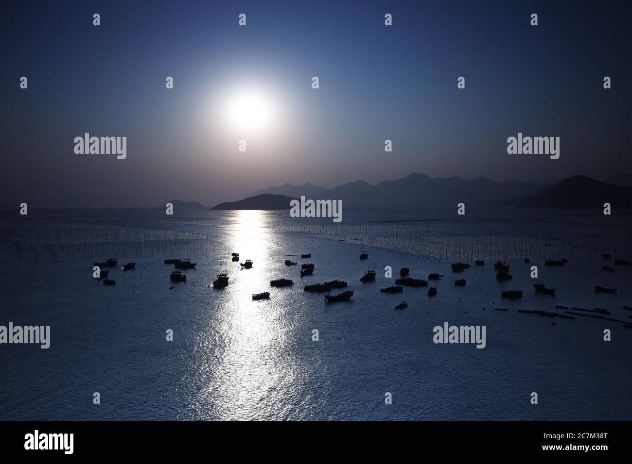 Beautiful view of the sunlight reflecting on the water full of fishing