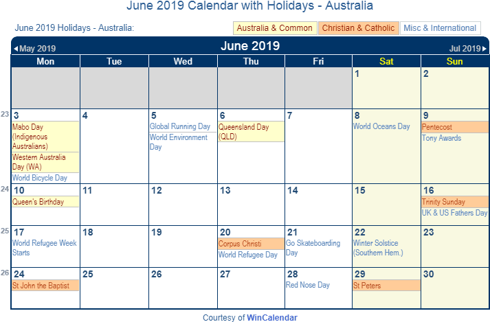 Download June 2019 Calendar With Holidays Australia International