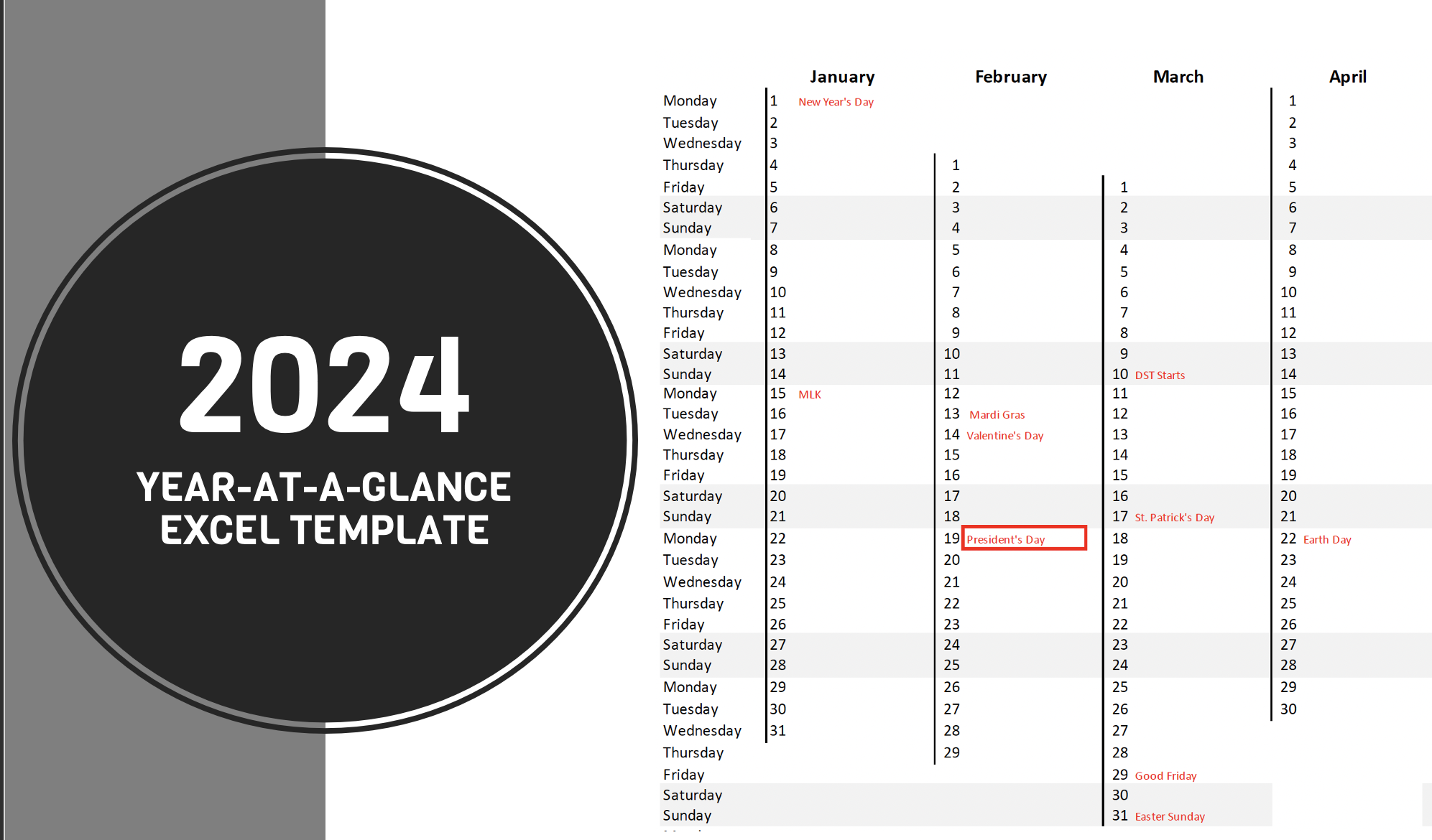 2024 Yearly Calendar Template Excel Excel 2024 Calendar With Holidays