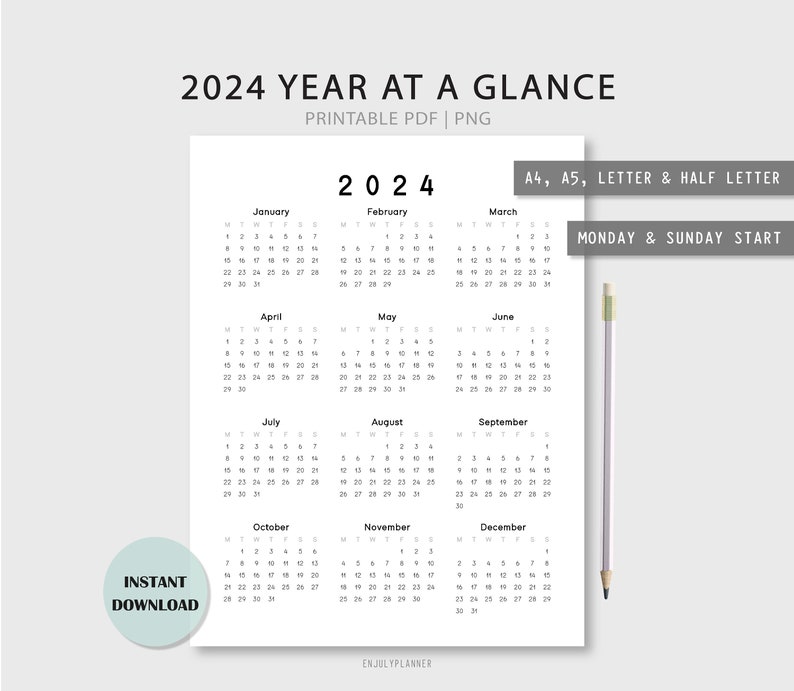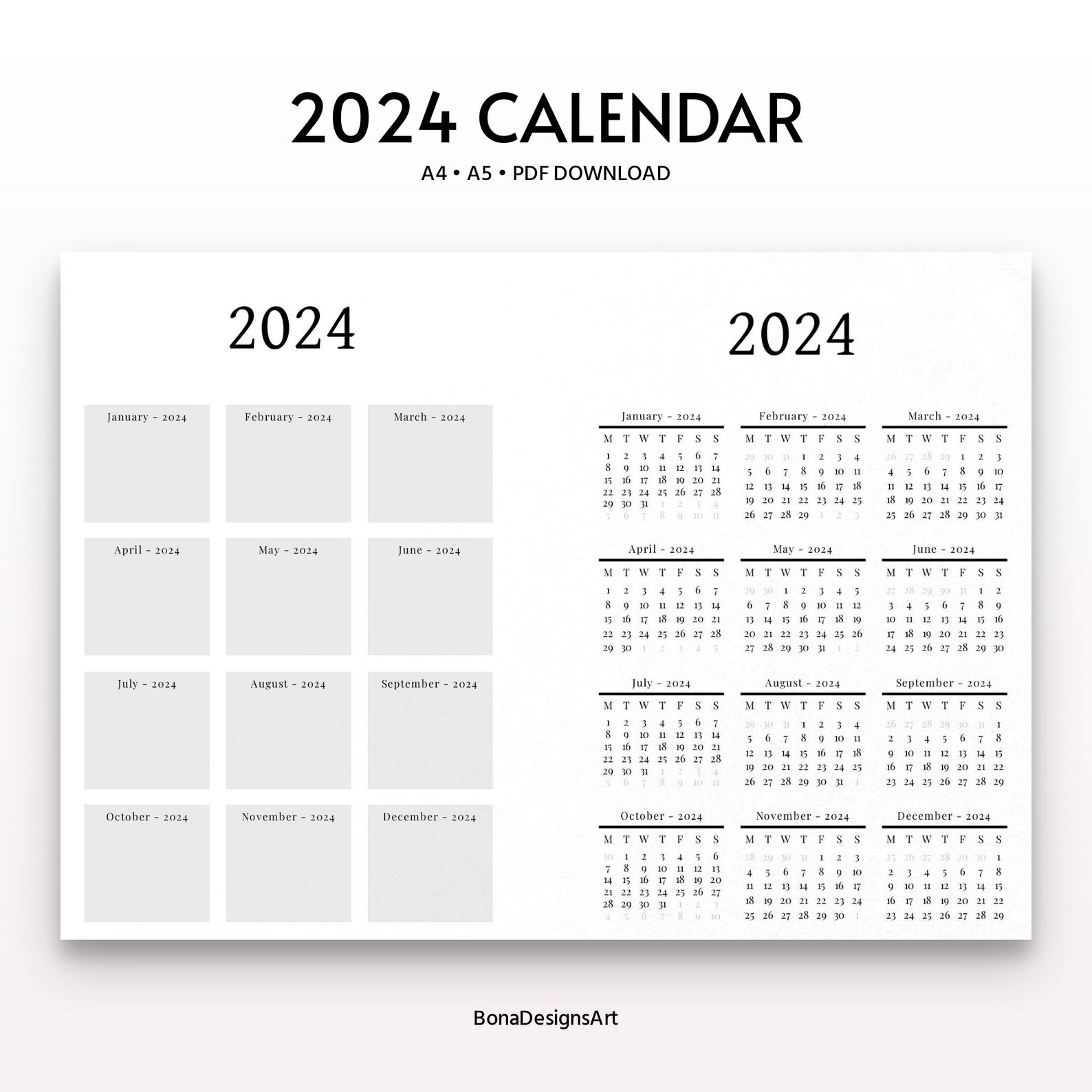 2024 Printable Calendar Calendar 2024 Year at a Glance A4 A5 US