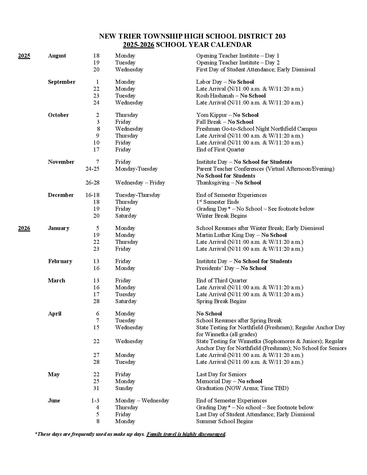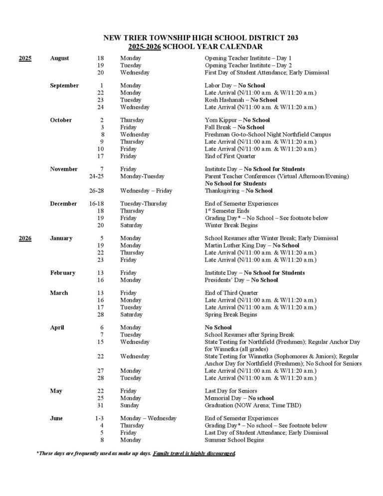 New Trier Township High School District 203 Calendar 2025 2026